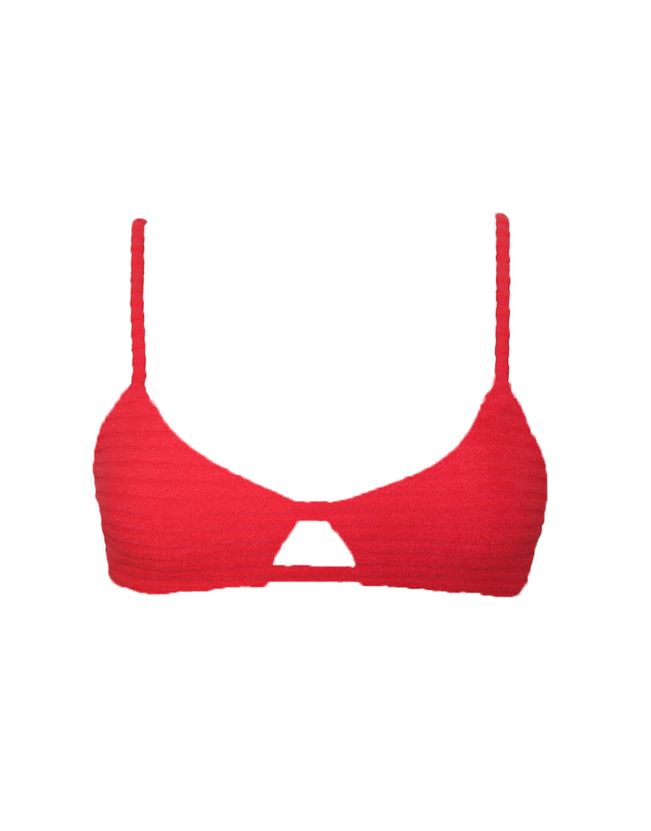 Top cortininha com cobertura pequena, alças paralelas reguláveis, amarração nas costas e detalhe de nó manual em corda elástica.