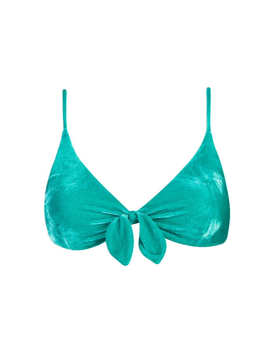 Top Prainha II com cobertura alta e detalhe de amarração no centro do busto removível. Alças paralelas reguláveis, fecho nas costas e metais escovados revestidos em Ouro.